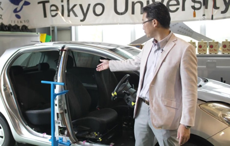 図1 交通事故による傷害軽減を目的とした自動車内部構造を説明している様子