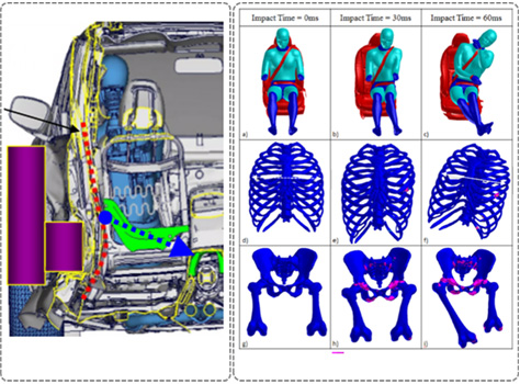 交通事故で自動車が衝突している時間は、人の瞬き(0.1~0.3秒)の約5分の1であり、衝突実験による乗員の動きやエアバッグの展開、自動車の変形の様子などの分析が難しいです。そのため、一般にコンピュータシミュレーションを使った技術開発が行われています。図2は運転席側に自動車が衝突する側面衝突のコンピュータシミュレーションの様子です(図は左ハンドルの車です)。このように、実験ではできない衝突過程の乗員の様子を自動車の断面で評価し(図2左側:後席から見た視点)、現実には実験が難しい人体を使った細かい評価(図2右側)をすることも、コンピュータシミュレーションによりできるようになります。図中の乗員は人体モデルで、側面衝突による骨盤骨折に対する技術開発を行った時に実施したコンピュータシミュレーションの一例です。