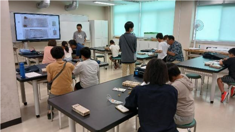 障害物を乗り越えて進むことができるロボットについての簡単な説明を行った後、電池、モータ、歯車、クローラなどの基本部品を用いて車両型ロボットを製作した。ロボットはクローラによって走行する方式を採用しており、車輪やクローラの取り付け方を工夫することで、それぞれ外観や走行性能の異なるロボットを作り上げることができた。部品の組み合わせや取り付け位置の違いによって走行特性が変化することを、実際の作業を通して理解できた点が このイベント の 特徴である。 製作後には、準備した小さな坂や段差などの障害物を実際に乗り越えられるかを確認する実験を行った。一人ひとりが自分のロボットを操作し、動作の様子を観察した。うまく障害物を越えられない場合には、車輪の位置やクローラの張り具合を調整しながら、より大きな駆動力を得るための構造や取り付け方法を考えた。